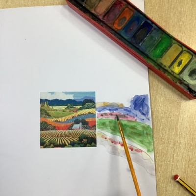 This week we used watercolours to mix colours and paint some fields, bushes and trees in the style of Gene Brown. We are building on all of our artistic skills ready to create our final masterpieces over the next 2 weeks.