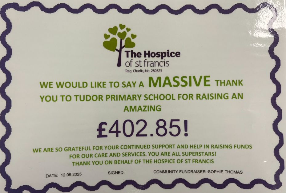 Tudor Owls voted The Hospice of St.Francis to be our chosen charity for this year. Their first planned event was a non-uniform day on Friday 5th July where they asked all children to come to school wearing something purple. The amazing families of Tudor raised £436.35.