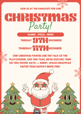 Tomorrow’s Christmas Movie Night is already sold out but we are delighted to share that we have organised two separate parties. As the poster shares, these will be on Tuesday 9th and Thursday 11th December. If parents want to book the Hangout Christmas Parties, make sure your wraparound care accounts are topped up with the appropriate amounts (£12 or £15) and then EMAIL in to admin@tudor.herts.sch.uk to book as the system currently is not accepting bookings for these dates.