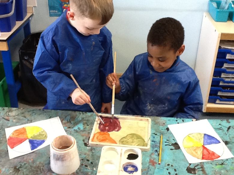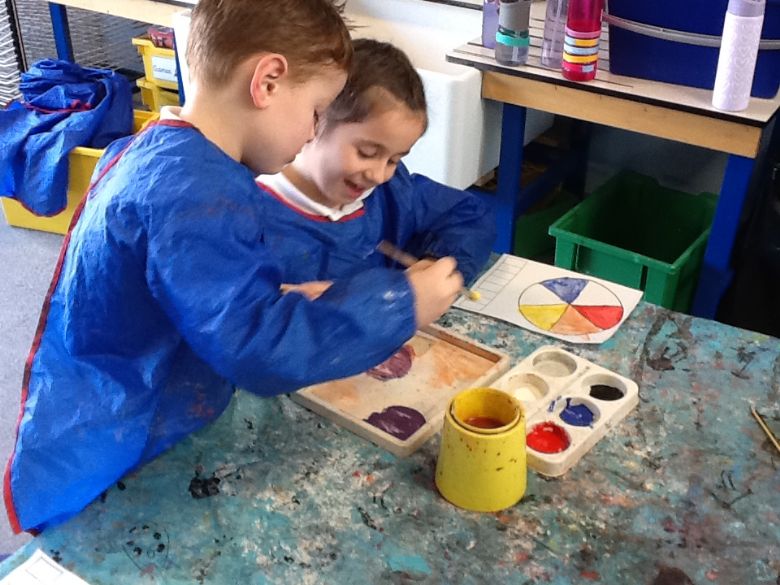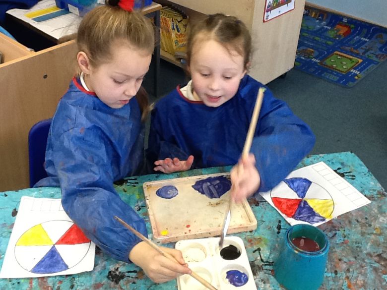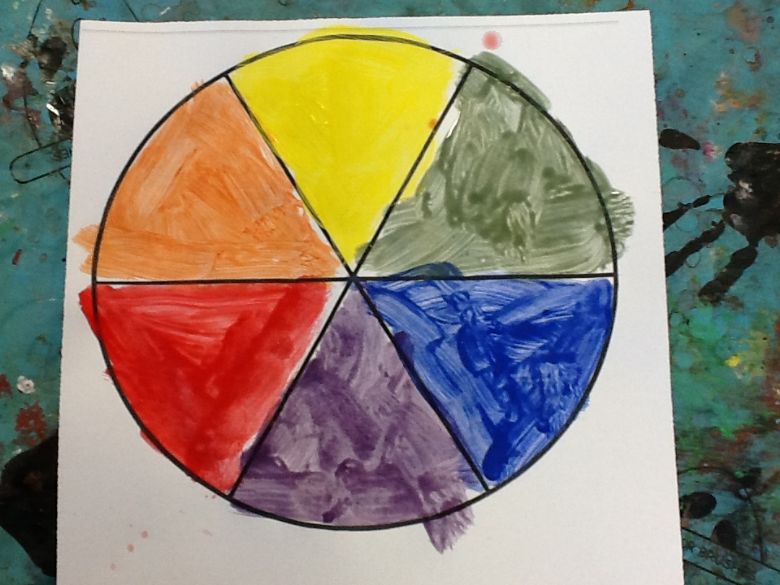 This week we used the poster paints. We used the primary colours to mix the secondary colours on a colour wheel. We then chose one colour and added different amounts of black and white paint to change the tone.