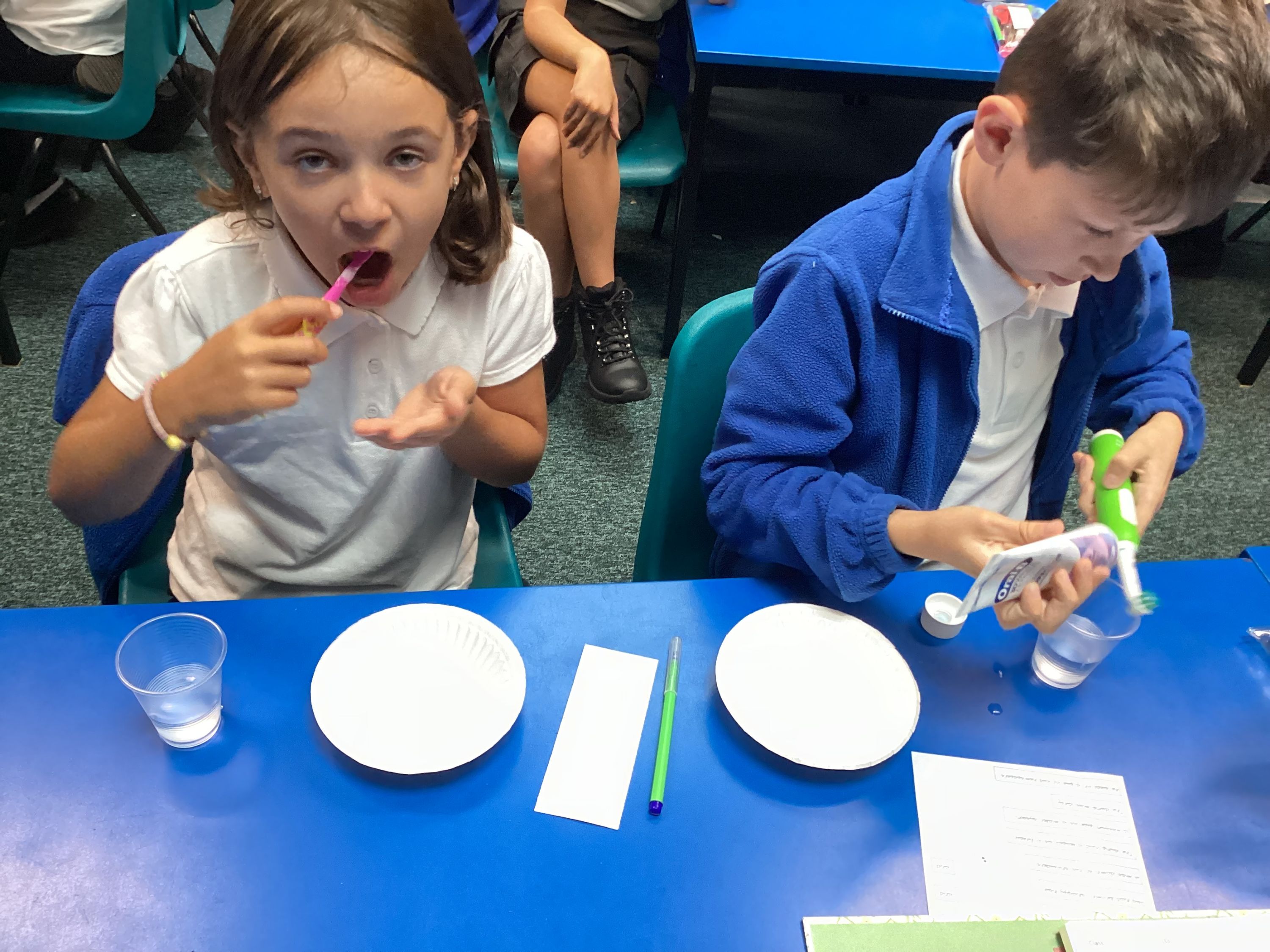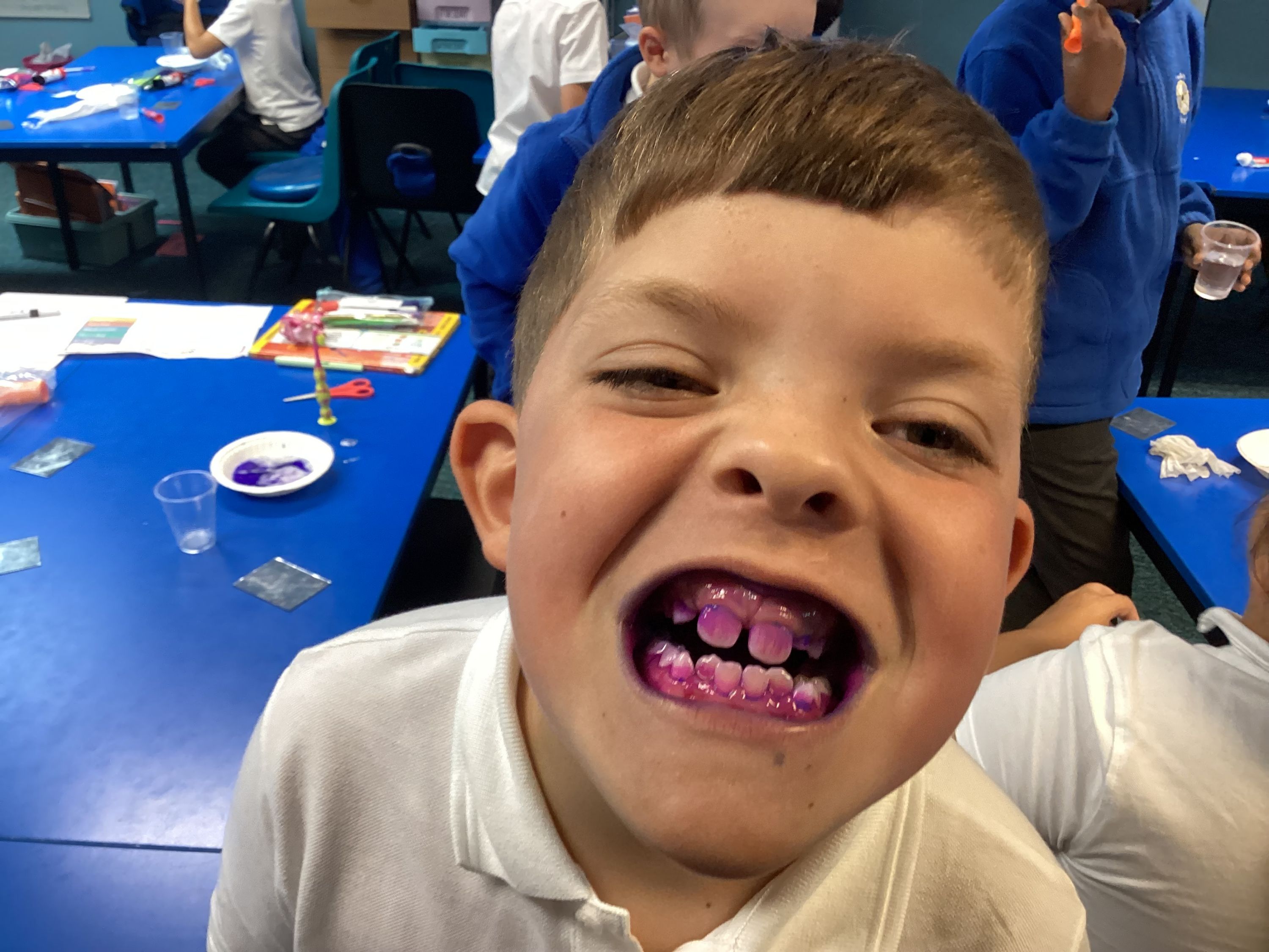 Then, we moved onto the importance of keeping our teeth healthy and clean. For this, we ate a disclosing tablet to show the plaque on our teeth. We found this super useful to see where we may not be brushing as well.