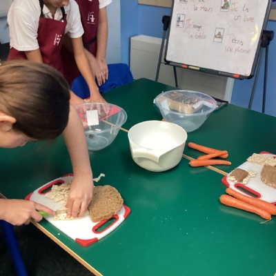Practising chopping and peeling skills when preparing bread and carrots for taste testing!
