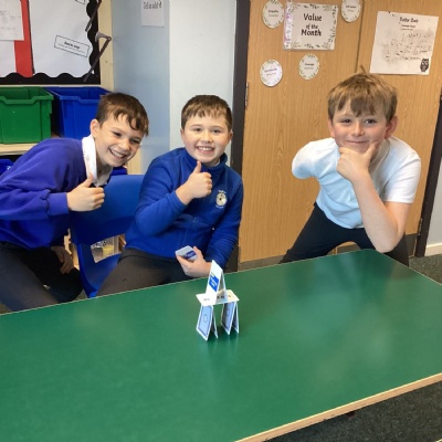 This week we had a slightly shorter PE slot due to enjoying a musical assembly, so we worked on our team work skills in making card towers - we found it tough at first but look at the tower these three have made!
