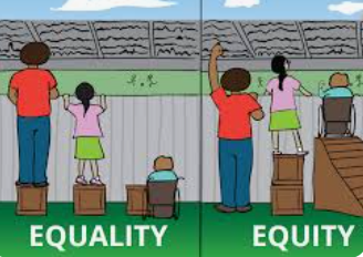 Equity means giving people what they need to have a fair chance, rather than giving everyone the exact same thing (like providing different tools for different needs). The image below also sums up equity beautifully.