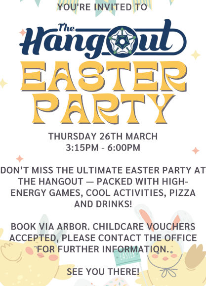 Hangout Easter Party and Hangout in the Holidays The Hangout team are excited to share their Easter Party on Thursday 26th March. They are already taking bookings for the summer provision from Wednesday 22nd July to Friday 7th August. We believe our club is excellent value and we will be offering further summer holiday discounts to those who make block bookings for each week. Booking is now open on Arbor.