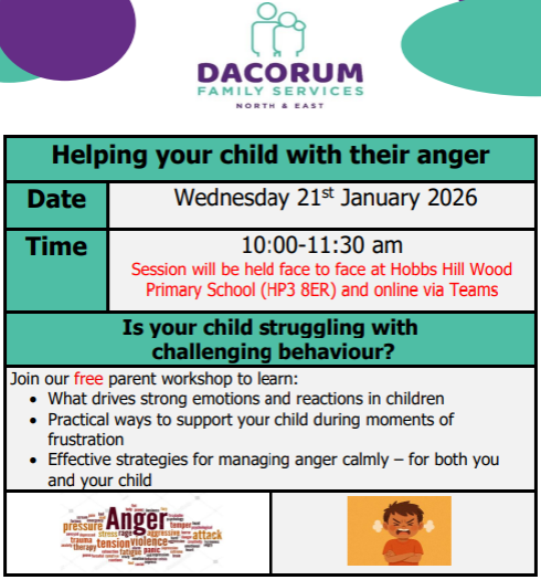 Delivering Special Provision Locally (DSPL) recently published their 'End of 2025 Parent/Carers Newsletter', to access this newsletter use the following link: https://dacorumdspl.org.uk/online-resources-for-parents-and-carers/. The newsletter provides information about courses and support available to parents/carers of children in Hertfordshire. Dacorum Family Services are offering a free 'Helping your child with their anger' parent workshop on Wednesday 21st January, 10-11.30 am.