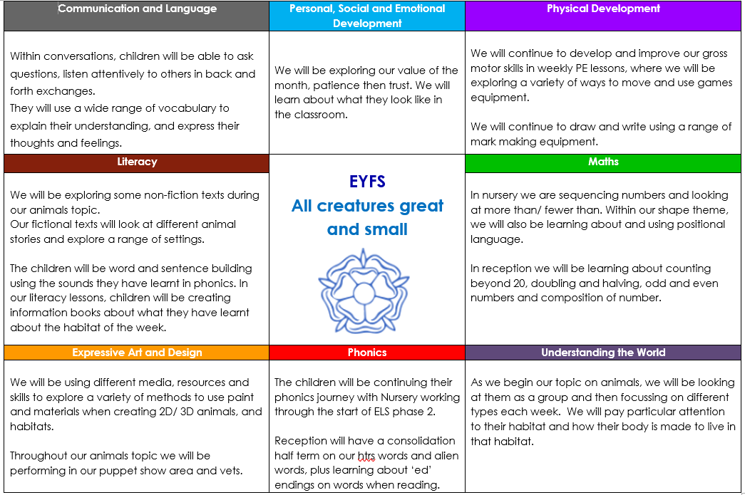 This half term we are learning about the animal world. We will begin our new topic theme by investigating jungles and rainforests. We will look at the habitat itself and how the animals are designed to live in that habitat. We will then explore, under the sea, pets, on the farm, minibeasts and the amazing world of birds.