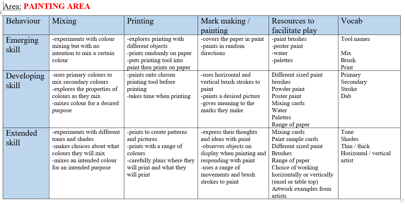 This is the second year of our new skills-based curriculum. We have created a document that outlines progression of skills from the start of nursery to the end of reception. There are twelve areas of focus, which intertwine with each other in both the indoor and outdoor areas. The document ensures we are modelling and teaching children key skills in their play and modelling key vocabulary linked to the skills. Within an area of the learning there are key behaviours we are teaching the children so their learning and experiences are constantly developing and growing.